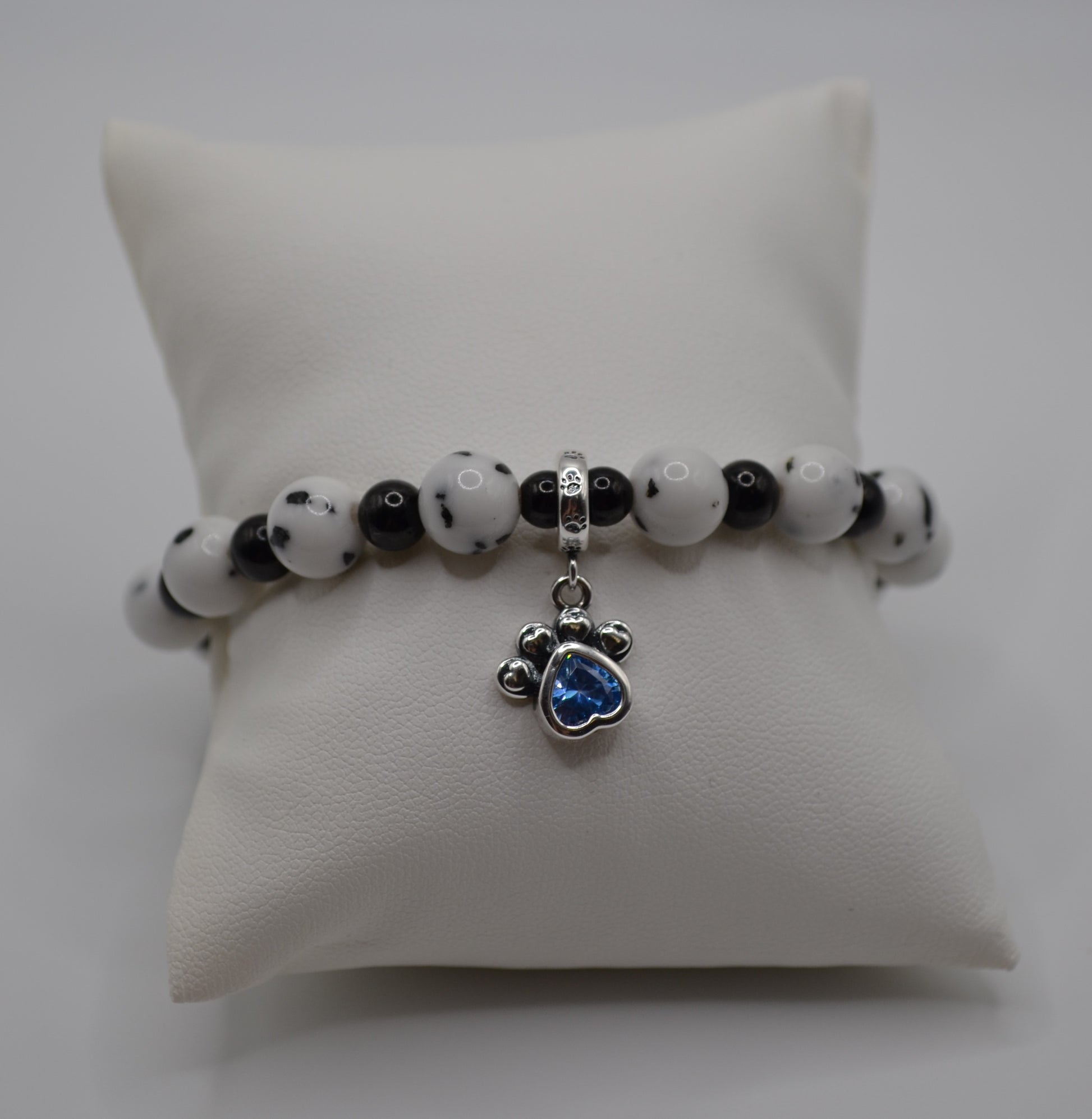These are another new addition to the bracelets in our dalmatian collection made with 8mm dalmatian stone beads and 6mm silver spacers beads then finished with a sterling silver blue paw charm or if you wish a pink charm is available. A sweet gift to yourself or a loved one to celebrate your gorgeous doggies :)