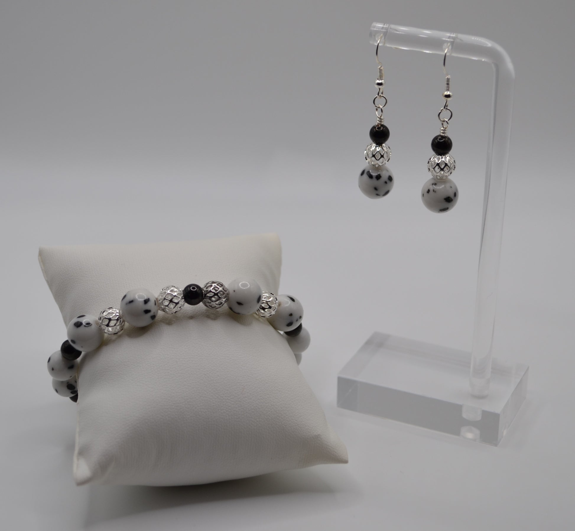 This is a silver cage and black ball dalmatian beads set where you get the matching earrings and bracelet which both can actually be bought together or separately the choice is yours. Just ensure to let me know what bracelet size is right for you as it is elasticated, size guide attached within these images.