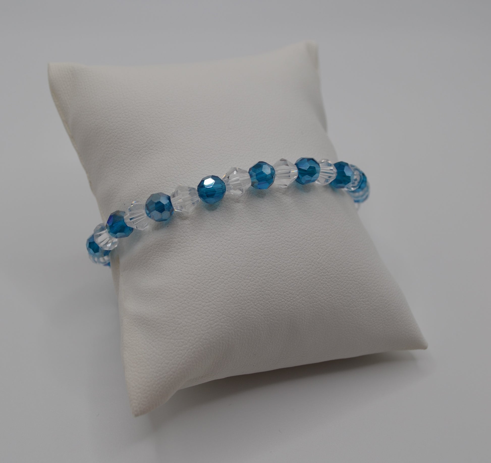 This is my new deep blue and clear bracelet made with acrylic beads which both compliment each other perfectly. It is a pretty addition to add to any jewellery collection just let me know the right size for you as this product is handmade on elastic.