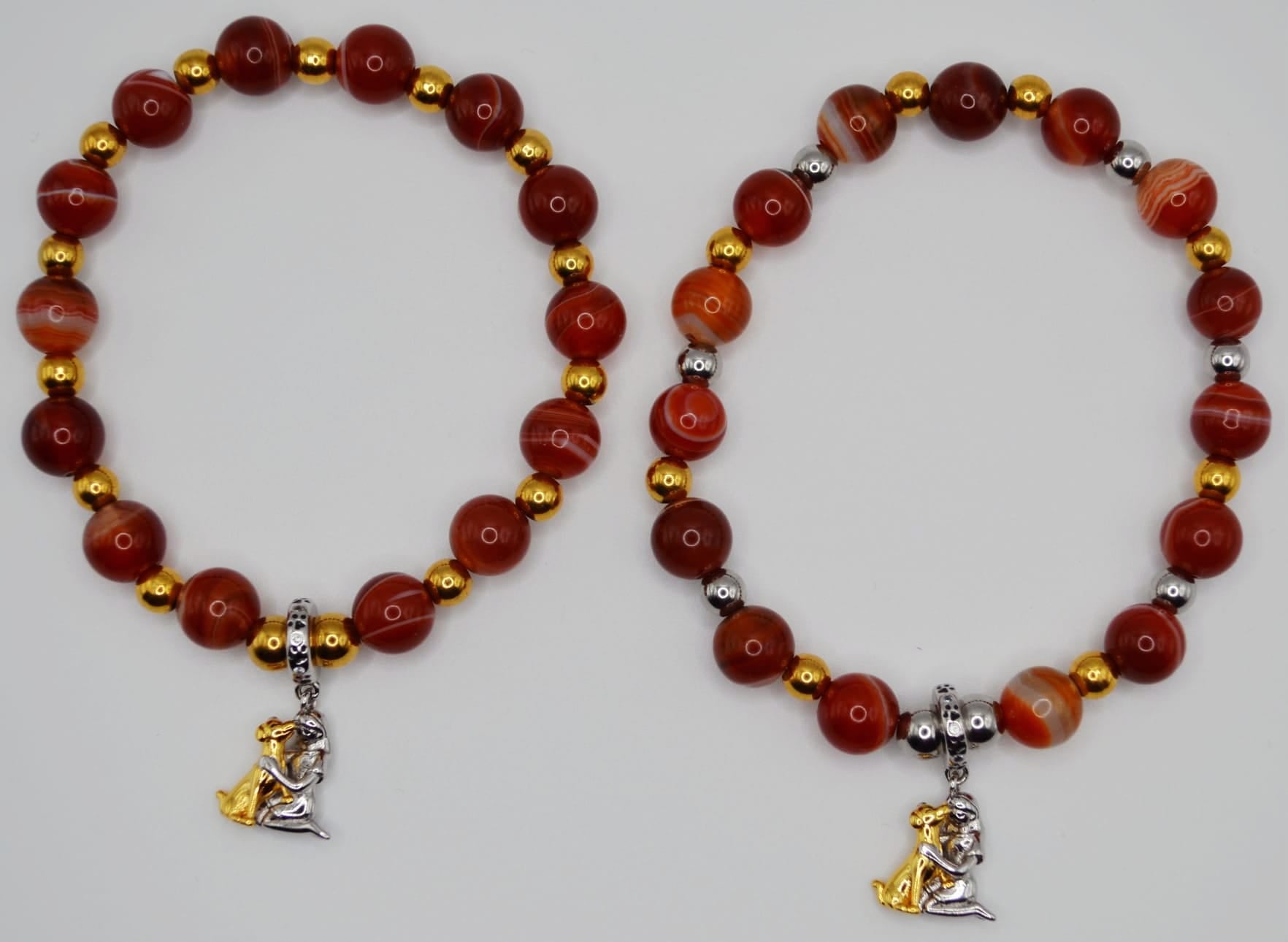 Another addition to my Hungarian Vizsla collection is here, Made with 8mm natural stone red carnelian agate beads and gold stainless steel 6mm ball beads as well as good quality elastic. Finished with a 925 sterling silver dog and girl charm. This one is very beautiful will make the perfect addition to any collection of jewellery.