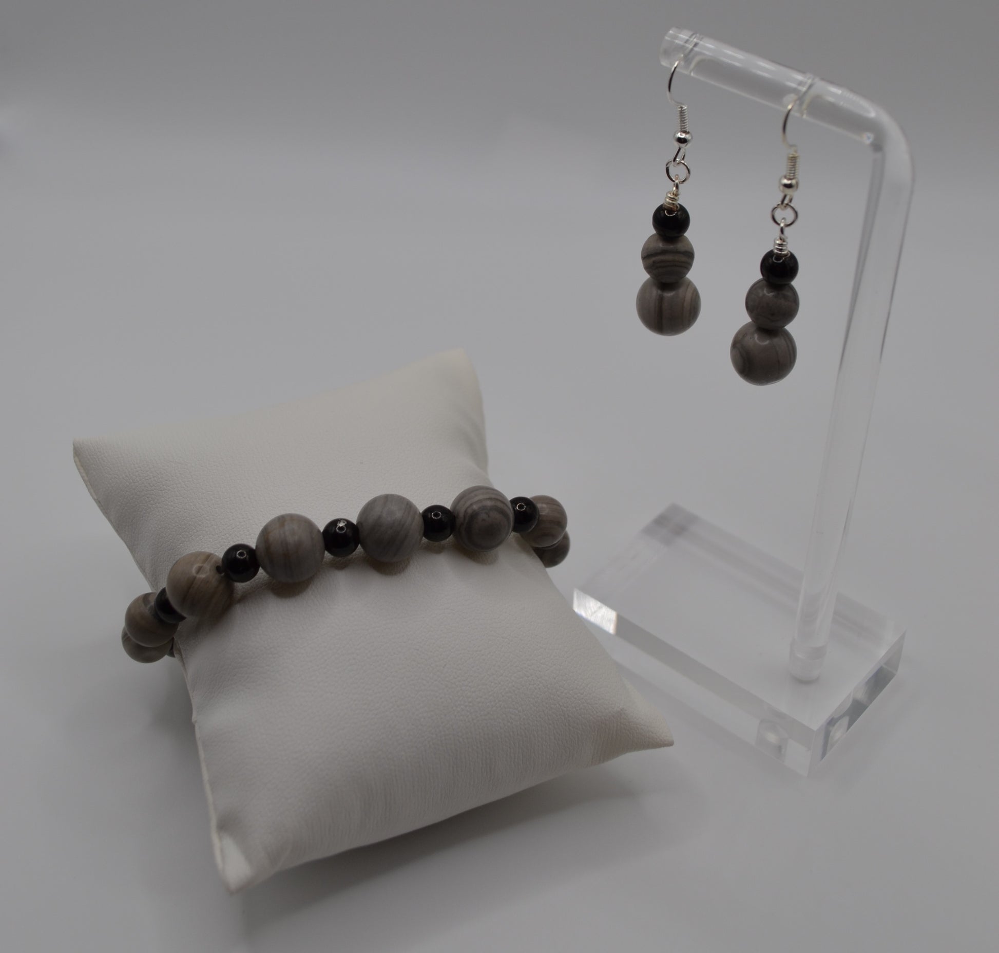 My weimaraner and black ball beaded bracelet and earrings set. Both these items can be purchased separately if you wish both made with stone, stainless steel and plated materials as well a good quality elasticated so do let me know the right size for you.
